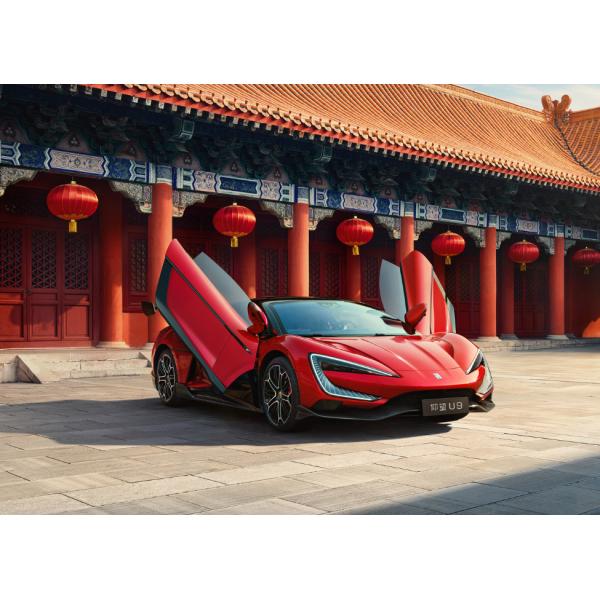 The U9 adopts an 800V electric architecture, so it can support DC fast-charging technology for large amounts of power. Officials claim that the U9 can support DC fast-charging of up to 500kW, and with charging sockets on the left and right sides of the body, it can be recharged from 10% to 80% in just 10 minutes, but in the AC part of the AC, it can only support up to 7kW AC charging box for home use, so even if you have a 22kW AC charging box at home, it can only support 7kW AC charging box at home. Even if you have a 22kW AC charging box at home, you can only charge it with 7kW power, and it takes 7 hours to charge from 10% to 80%. In terms of appearance, the U9 undoubtedly adopts the low-slung and low wind resistance coefficient design of traditional supercars, with scissor doors lifting upwards on both sides, a large rear wing with automatic retraction, 21-inch wheels, Pirelli P Zero high-performance tires, and carbon-ceramic discs with six-piston front and four-piston rear brakes. The brakes are carbon ceramic discs with six-piston front and four-piston rear calipers.